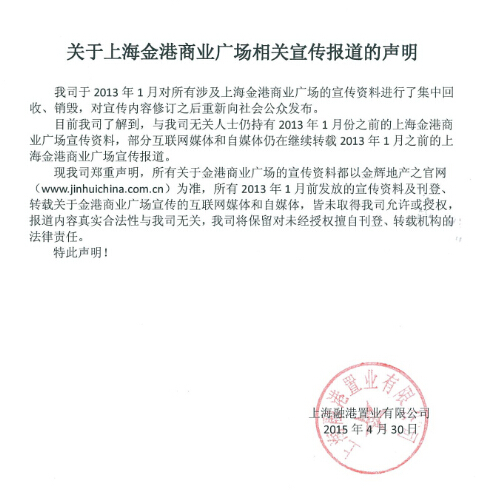 關(guān)于上海金港商業(yè)廣場相關(guān)宣傳報(bào)道的聲明