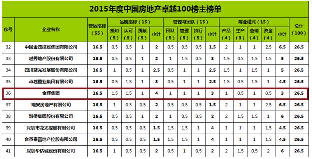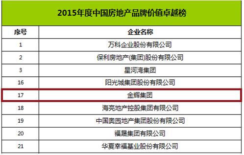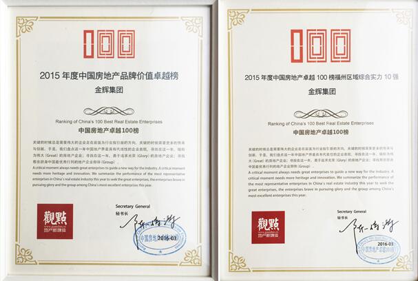 2016年3月22日,在剛剛結(jié)束的2015年度中國(guó)房地產(chǎn)卓越榜發(fā)布會(huì)上,金輝集團(tuán)榮膺 “年度中國(guó)房地產(chǎn)品牌價(jià)值卓越榜17強(qiáng)”、“年度中國(guó)房地產(chǎn)卓越100榜36強(qiáng)”、 “福州區(qū)域綜合實(shí)力10強(qiáng)榜8強(qiáng)”三項(xiàng)榮譽(yù)。